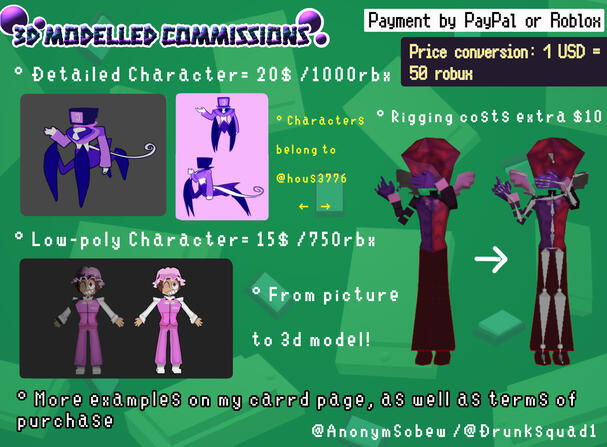• You must send a clear image of your character (Front, Side and Back profile) to make the final result as accurate as possible, if not, I'll assume the rest of the character's appearance.